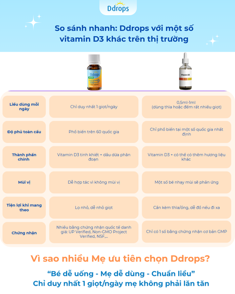 Đôi khi, điều quan trọng nhất trong việc chăm con không phải là “dùng loại gì cao cấp nhất”, mà là duy trì được thói quen đều đặn – đúng liều – không áp lực cho cả mẹ và bé. Ddrops làm được điều đó – bằng sự đơn giản, hiệu quả và an toàn.